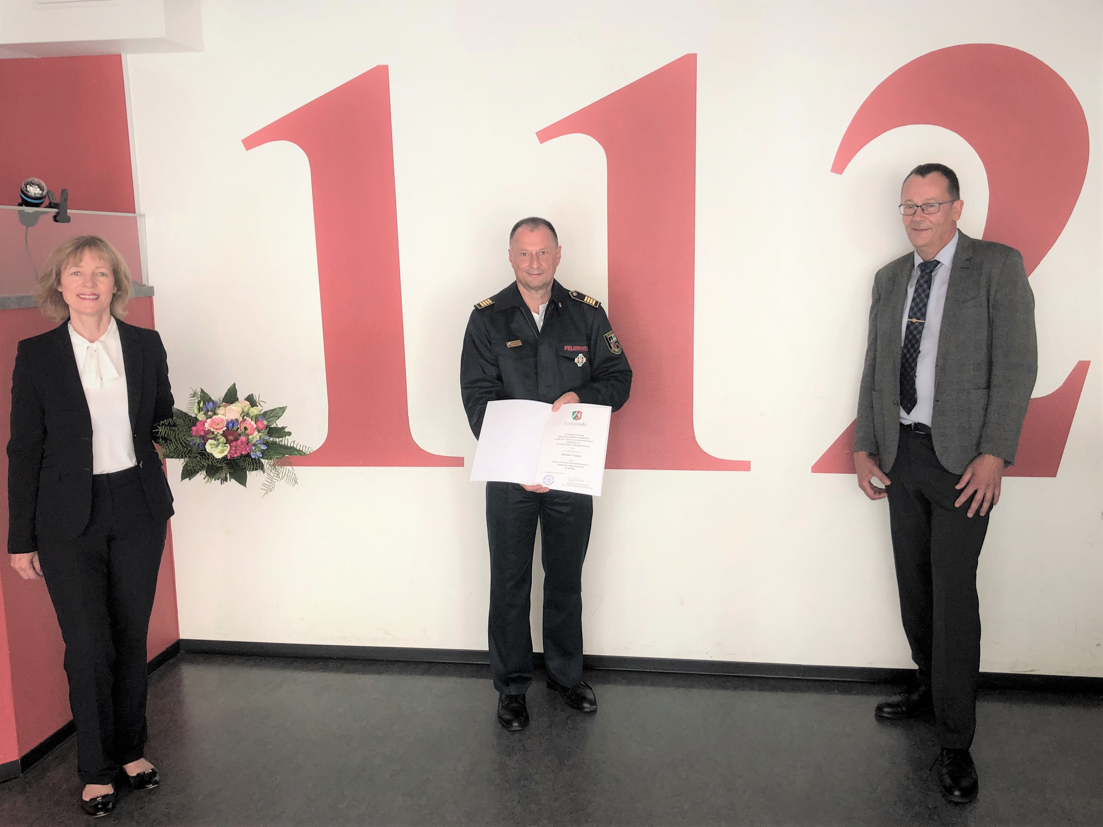 GE. Der Leiter der Gelsenkirchener Feuerwehr, Michael Axinger, ist mit dem Brand- und Katastrophenschutz-Verdienst-Ehrenzeichen in Silber ausgezeichnet worden. Im Beisein von Stadtdirektorin Karin Welge überreichte ihm der Hauptdezernent der Bezirksregierung Münster, Reiner Dewulf, am Mittwoch, 12. August, am Rande der Sitzung des Krisenstabes der Stadt das Ehrenzeichen sowie eine Urkunde.