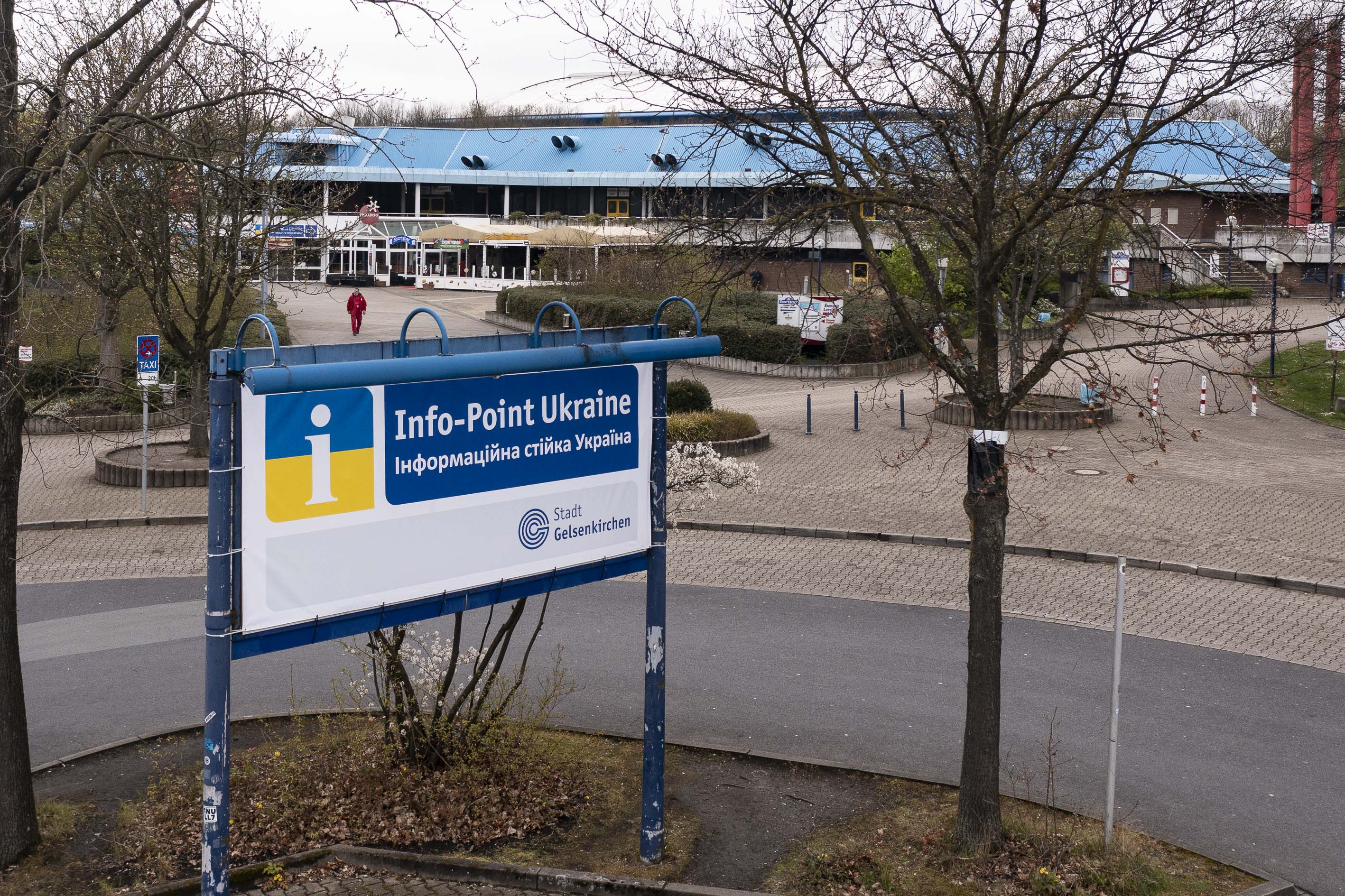 Ein Hinweisschild weist den Weg zum Info-Point für Geflüchtete aus der Ukraine. Bildrechte: Stadt Gelsenkirchen
