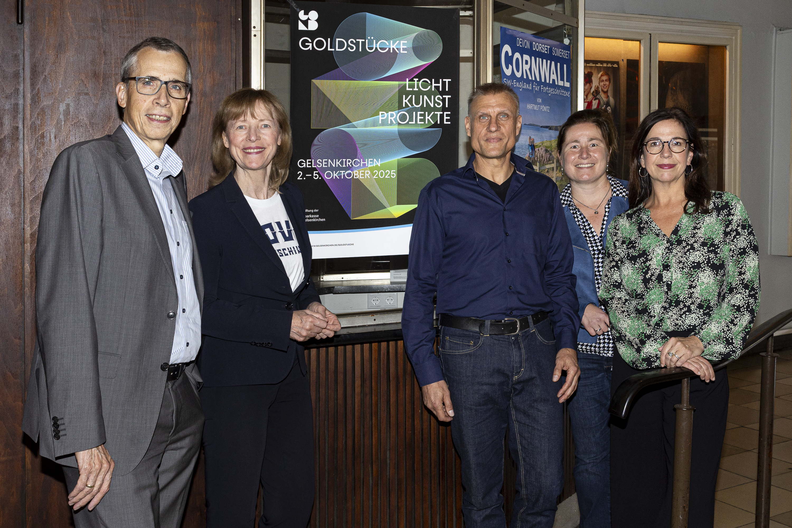Foto (v.li. n.r.): - Michael Klotz, Vorstand der Sparkasse Gelsenkirchen, OB Karin Welge, Hendrik Wendler, Künstlerischer Leiter der „Goldstücke Gelsenkirchen“ 2025, Ella Katharina König, Leitung Kunstmuseum, Andrea Lamest, Leiterin des Referat Kultur.
