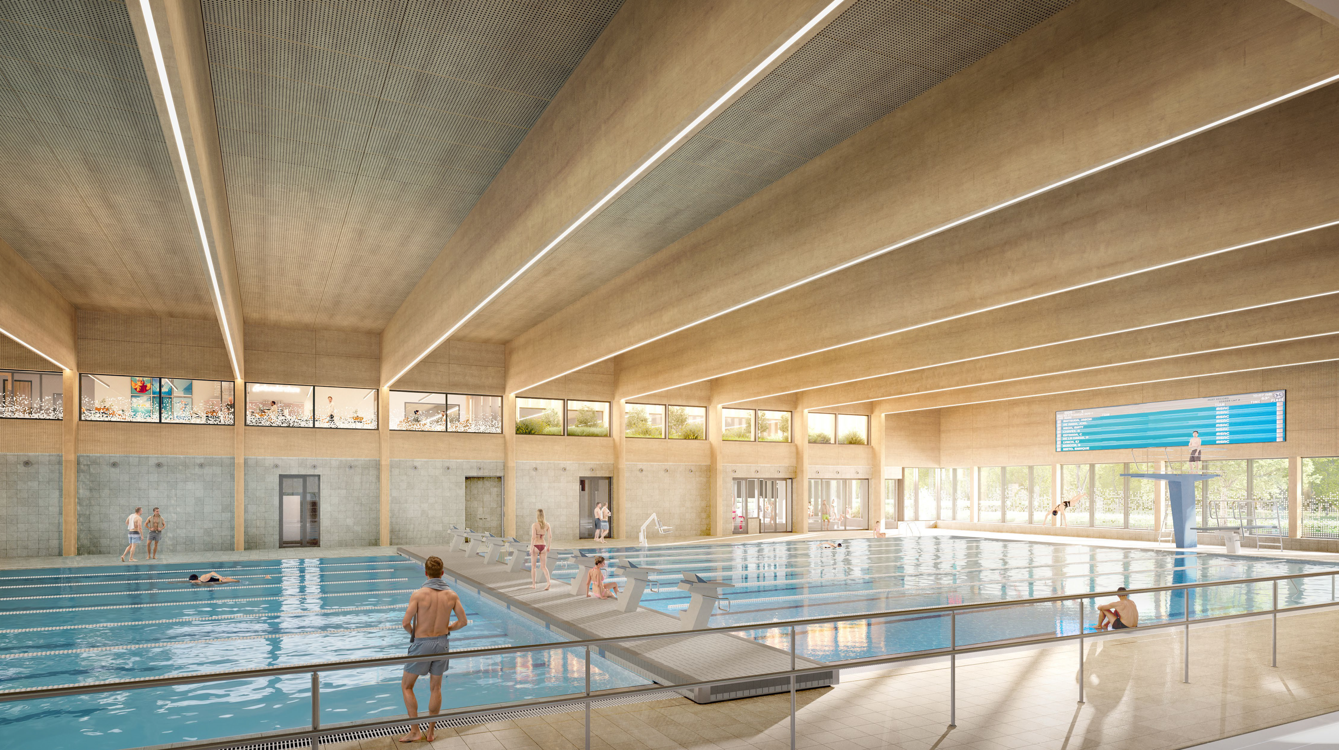 Der Keller und das Erdgeschoss stellen im Wesentlichen eine Ortbetonkonstruktion dar. Das Wettkampfbecken erhält eine Überdachung aus einer Holzbinderkonstruktion. Die Obergeschosse sind als Holzhybridkonstruktion vorgesehen mit Stahlbetonstützen und –Unterzügen sowie Vollholzdecken in der Brandwiderstandsklasse F90.