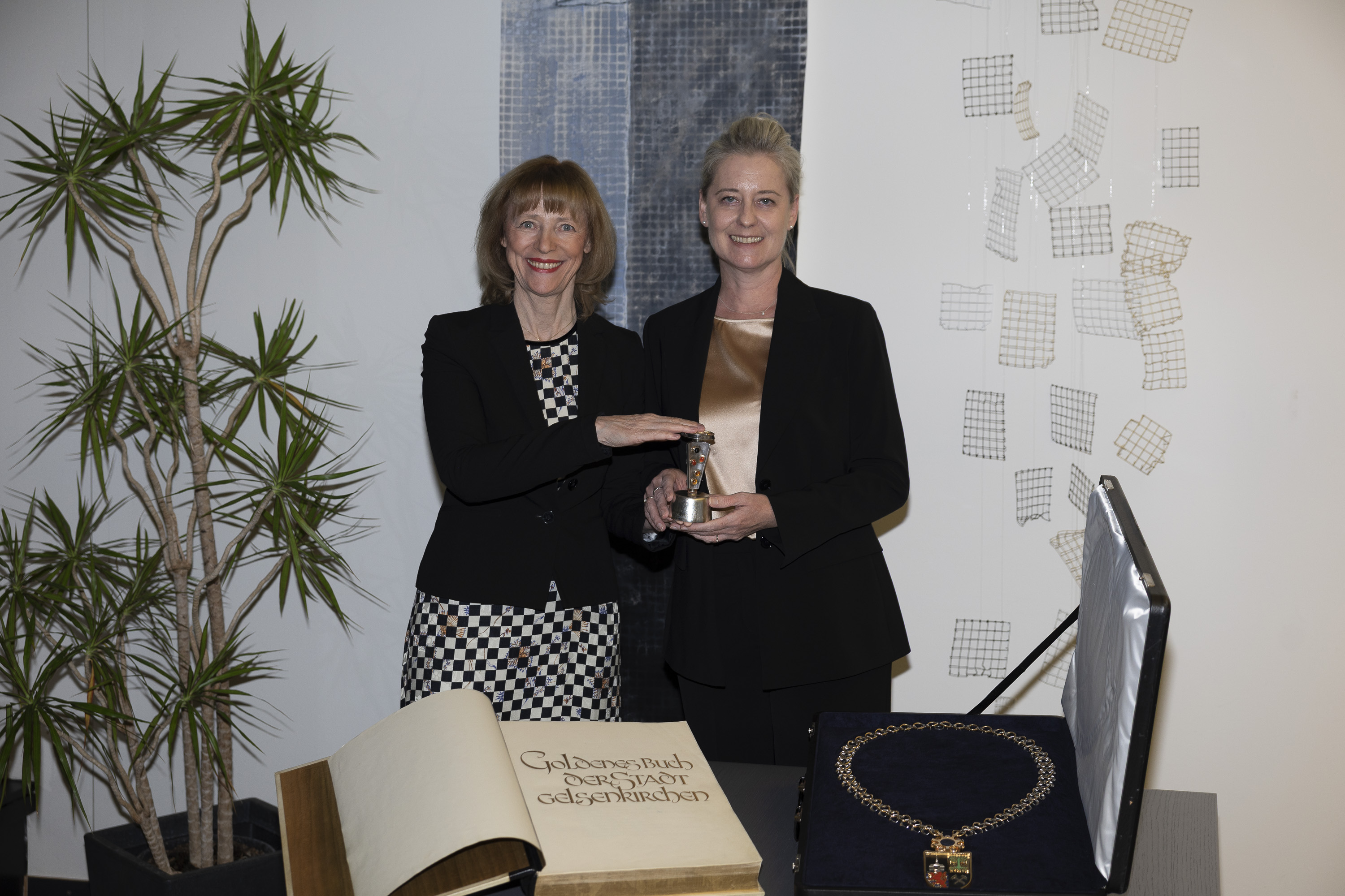 Am späten Nachmittag war es schließlich so weit: Karin Welge übergab Andrea Henze im Dienstzimmer des Hans-Sachs-Hauses die Amtskette, das Goldene Buch der Stadt sowie die Ratsglocke. Andrea Henze wird am 1. November die Amtsgeschäfte als Oberbürgermeisterin übernehmen.