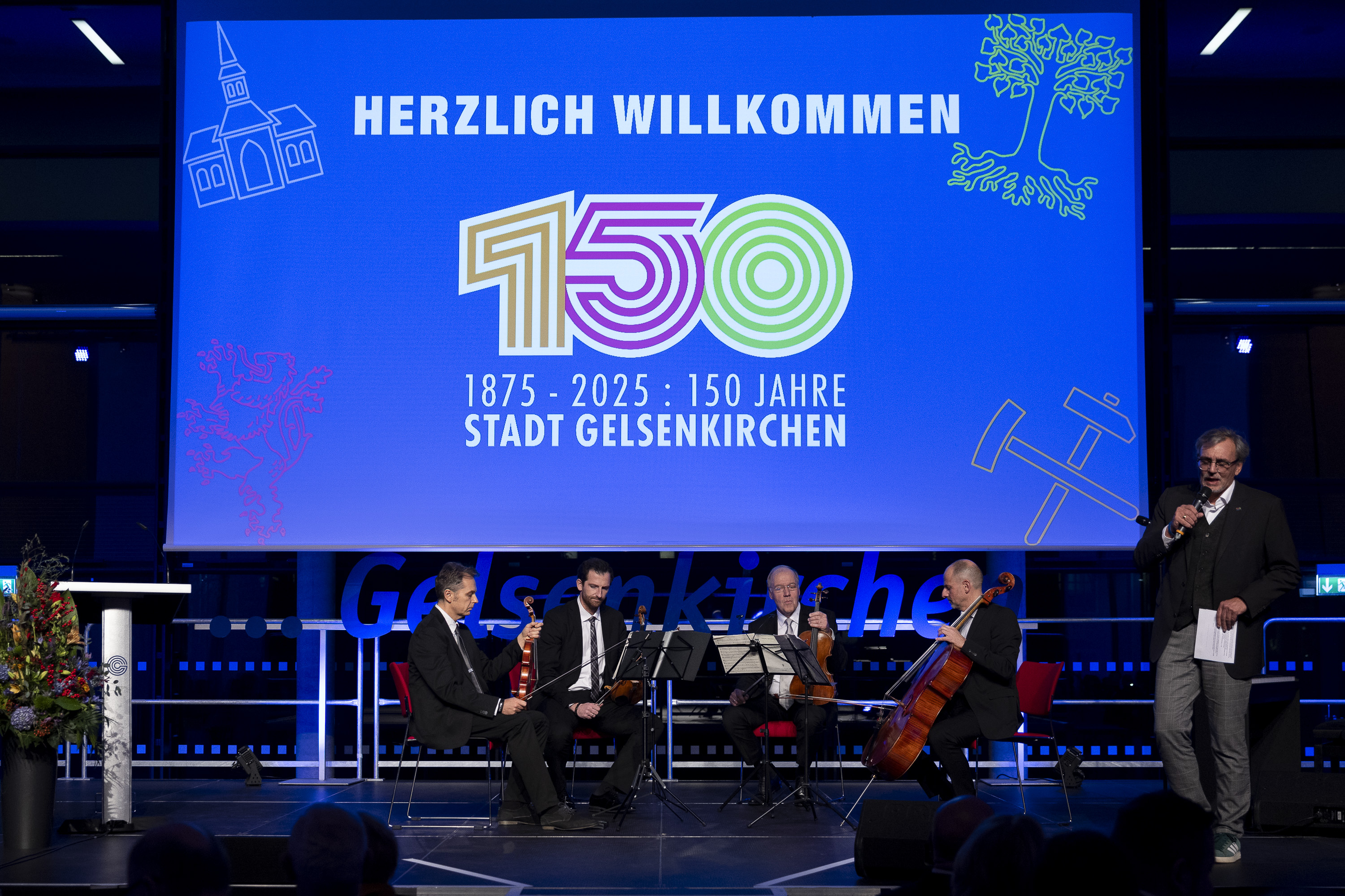Rund 200 geladene Gäste aus Politik, Kultur, Sport, Politik und weiteren Akteurinnen und Akteuren der Stadtgesellschaft ließen unter anderem zu den Klängen eines Streichquartetts der Neuen Philharmonie Westfalen (NPW) noch einmal die bewegte und bewegende Geschichte der Stadt Revue passieren.