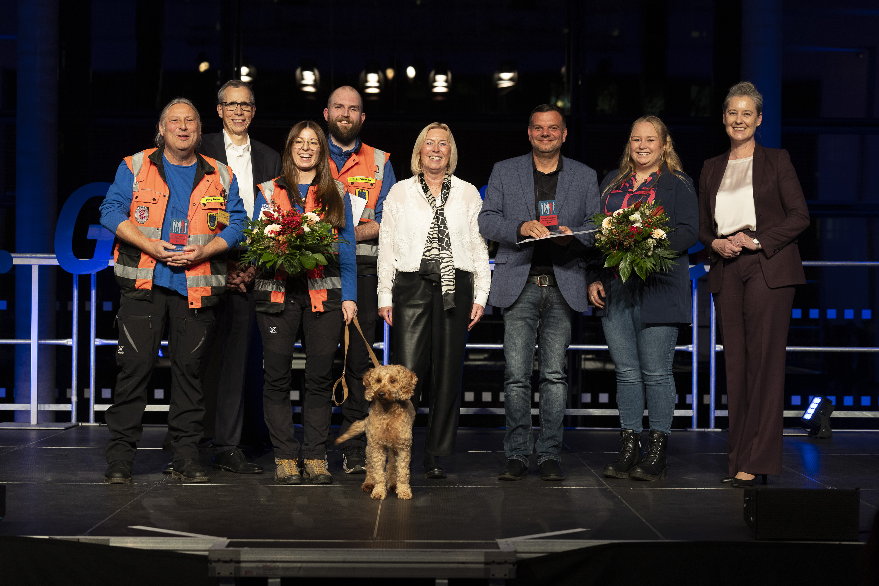 Bildzeile: Oberbürgermeisterin Andrea Henze, Michael Klotz, Vorstandsvorsitzender der Sparkasse Gelsenkirchen, und Iris Schappert, Vorsitzende der Ehrenamtsagentur Gelsenkirchen, gratulierten den Preisträgerinnen des Gelsenkirchener Ehrenamtspreises 2025: Lasse Gieskes, Elsbeth Jacoby, Karlheinz Rabas, Karlheinz Weichelt, Christian Krause (1. Vorsitzender des Tierische Seminare e. V.) und Jörg Küper (1. Vorsitzender des Rettungshundestaffel e.V.).