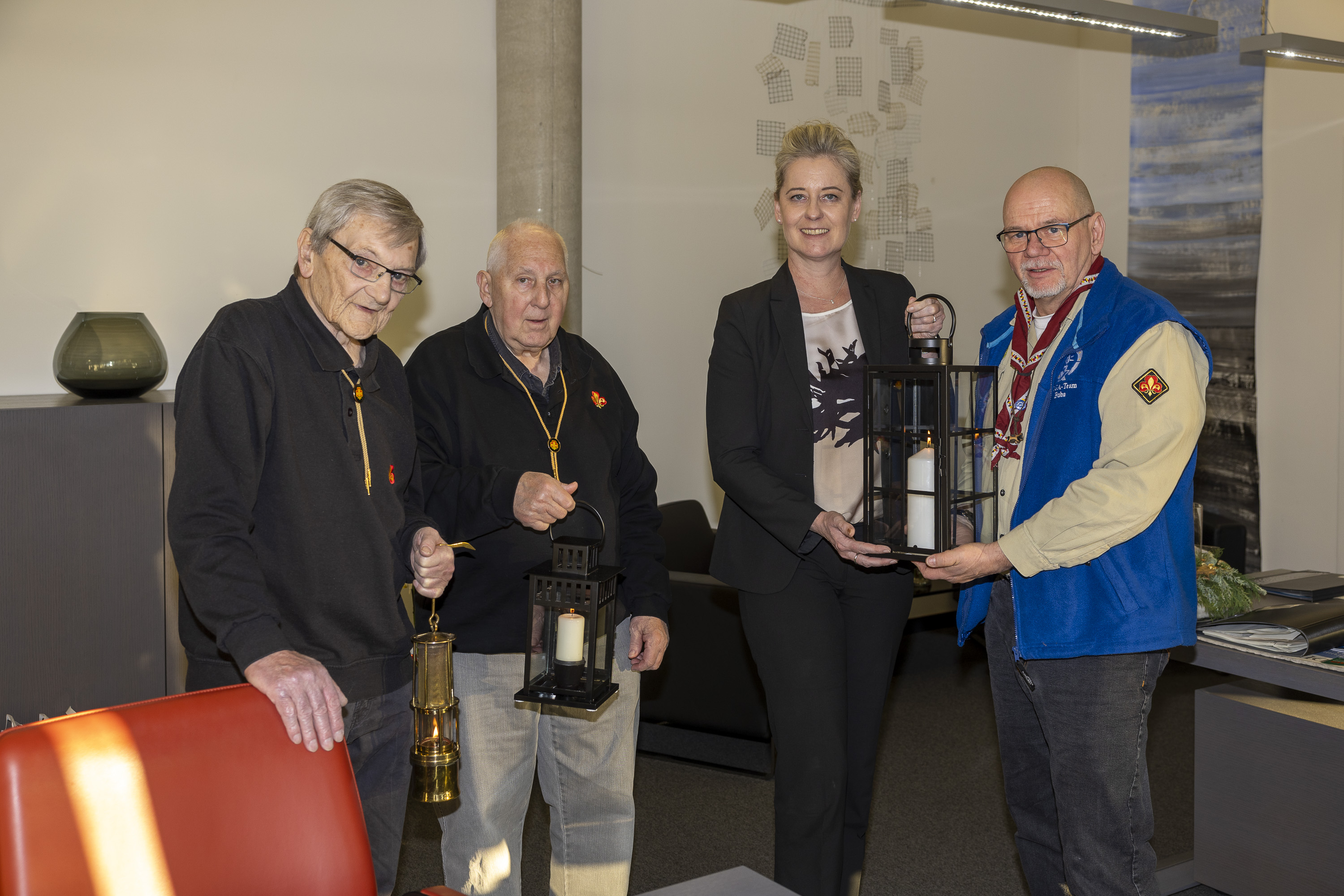 Bernd Gruttmann, Dieter Wehmöller und Michael Lucks von der Altpfadfindergilde St. Georg Gelsenkirchen haben Oberbürgermeisterin Andrea Henze das Friedenslicht aus Bethlehem überbracht. Bildrechte: Stadt Gelsenkirchen - Gerd Kaemper
