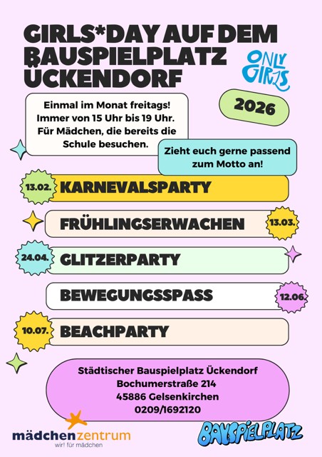 GE. In Kooperation mit dem Mädchenzentrum Gelsenkirchen e. V. finden auch im Jahr 2026 wieder monatlich die Girls*days auf dem städtischen Bau- und Abenteuerspielplatz Ückendorf statt.