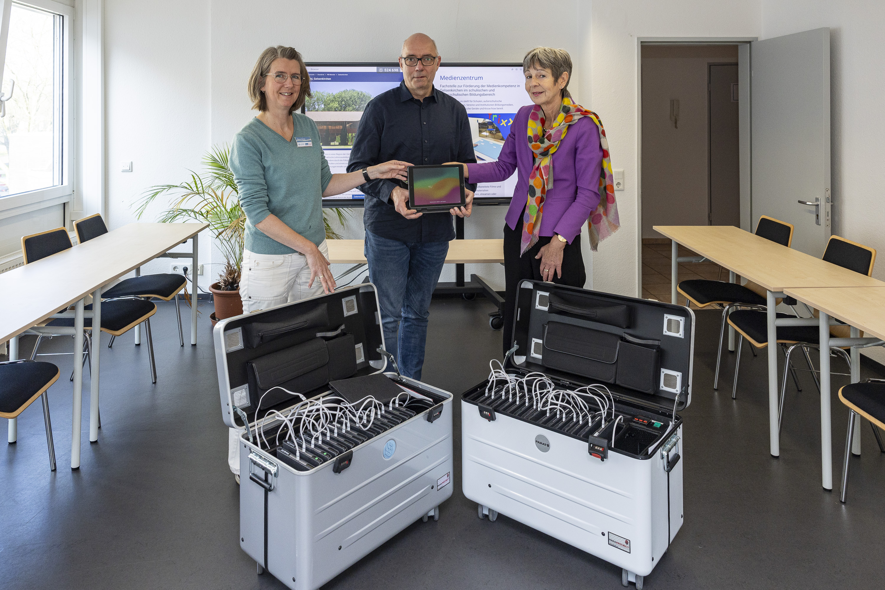 Oliver Funke-Tebart, Leiter ZfsL (Mitte) hat die iPad-Koffer an Bianca Herms, Bereichsleiterin der Stadtbibliothek (links), und Bildungsdezernentin Anne Heselhaus übergeben.. Bildrechte: Stadt Gelsenkirchen - Gerd Kaemper