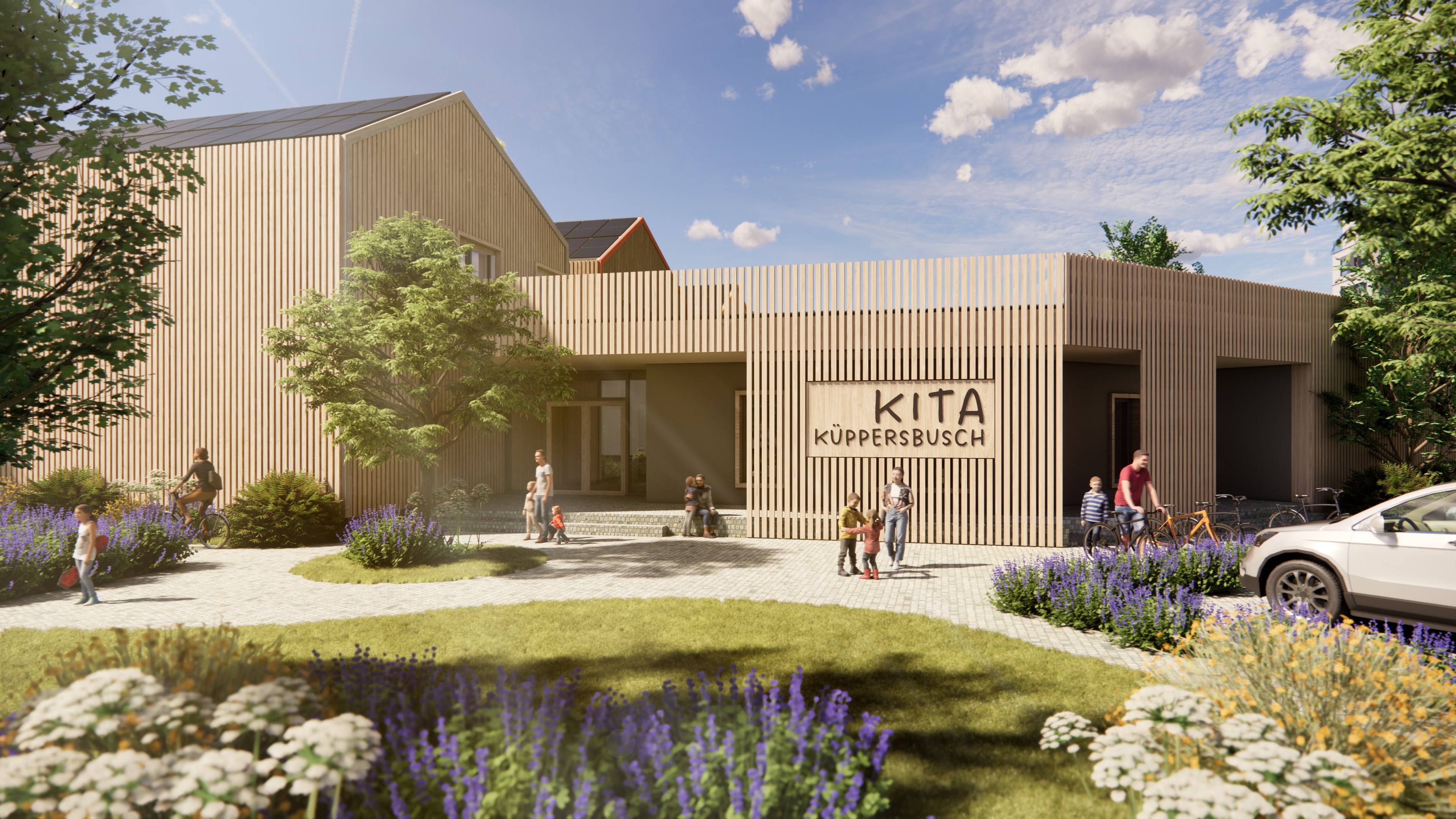 Das rund 2.140 Quadratmeter große Außengelände wird naturnah gestaltet und mit standortgerechten, heimischen Gehölzen bepflanzt. Die leichte Hanglage des Grundstücks zwischen Bahntrasse und Küppersbuschstraße wird planerisch so genutzt, dass barrierefreie Zugänge und funktionale Außenbereiche gewährleistet sind.