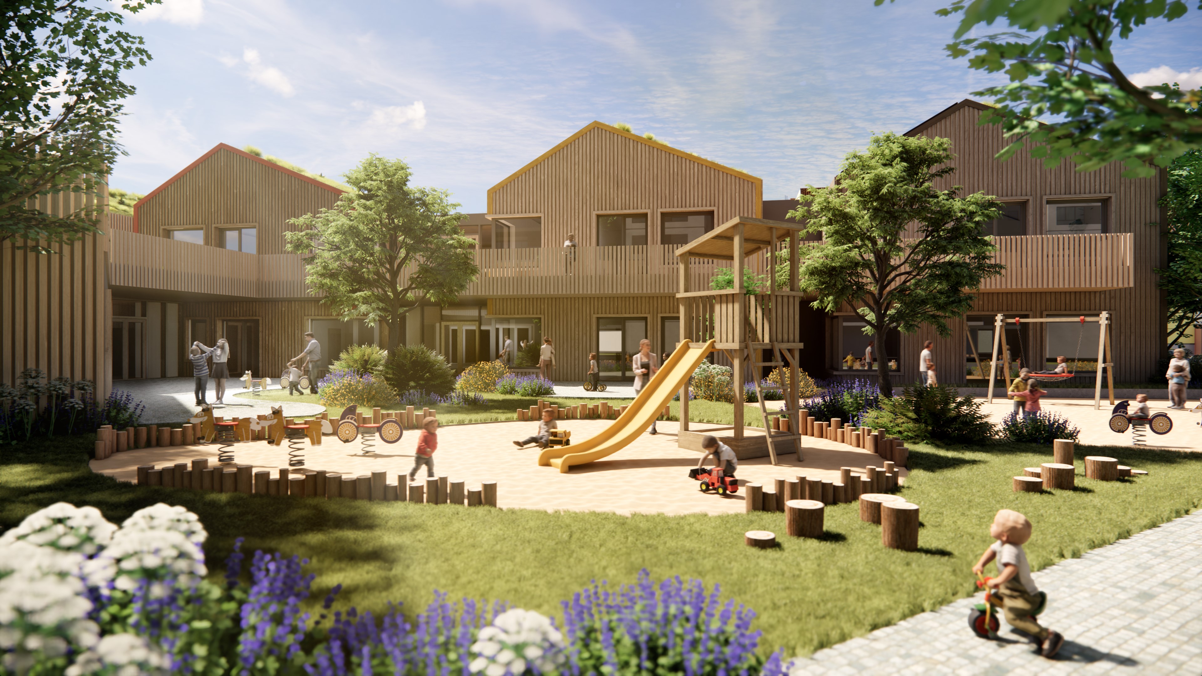 Besonderes Augenmerk gilt den sogenannten „Spielfluren“, die nicht nur der Erschließung dienen, sondern zusätzlich als Bewegungs- und Aufenthaltsflächen genutzt werden können. Die geplante Bruttogeschossfläche beträgt rund 2.050 Quadratmeter.